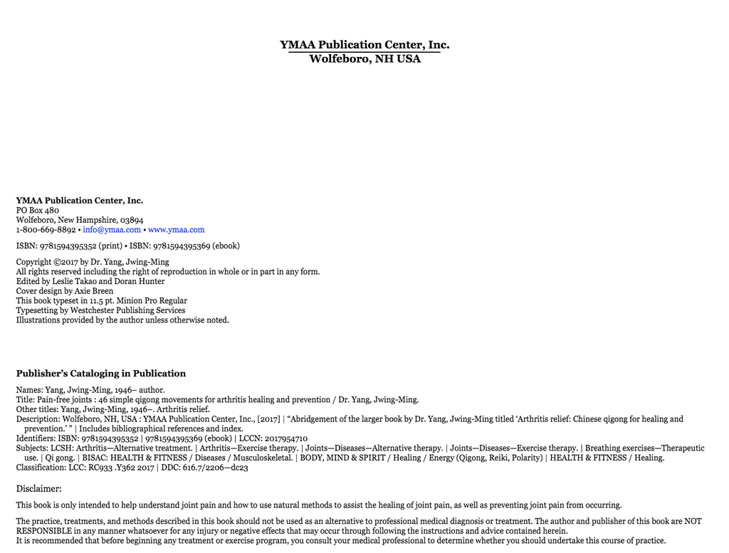 Motion is the key, and in this book Dr. Yang, Jwing-Ming will get you moving. You will regain natural, pain-free motion, and suppleness with qigong, a timeless Chinese art that promotes healing, flexibility, and balance. The gentle, meditative movements emphasize proper motion in coordination with breath, making qigong the right choice for preventing, treating, and even reversing arthritis.